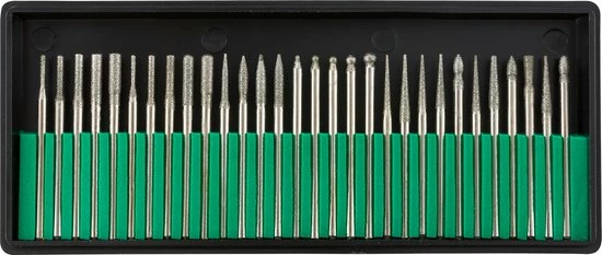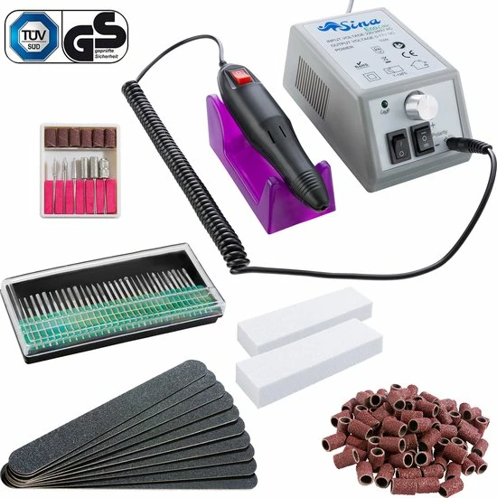 - Accessoires: Inclusief uitgebreide manicure accessoires: 6x standaard schuurdoppen / 10x zwarte vijlen / 30x diamant freeskop / 2x schuurblokken / 106 schuurhulzen.