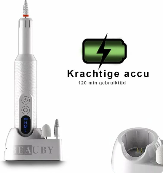 BEAUBY nagelvijl is voorzien van langdurige oplaadbare accu. De nagelfrees kan 120 min continue gebruikt worden. Na het gebruik plaats je de nagelvijl in de nagelvijlhouder, Zo kan de accu veilig weer opladen. Het is aan te raden om de nagelvijl 5 uur op te laden na gebruik.