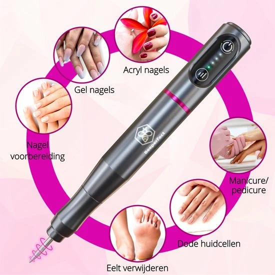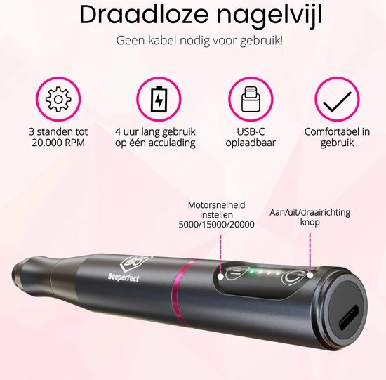 Haal met de 96-delige draadloze nagelvijl set van Beeperfect® alles in huis om je eigen handen en voeten volledig te verzorgen! Geen vervelende snoeren of draden, maar een compacte en lichte nagelvijl waarmee je draadloos aan de slag kunt gaan! De accu gaat tot wel 4 uur mee en is daarna eenvoudig op te laden via usb-c. Via het bedieningspaneel op de nagelvijl kun je de snelheid instellen van 5000 tot 20.000 RPM. De set wordt geleverd met maar liefst 25 verschillende nagelbitjes, 66 schuurrolletjes en diverse accessoires zodat je direct professioneel aan de slag kunt gaan.