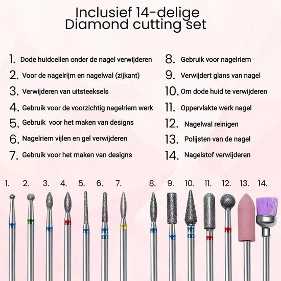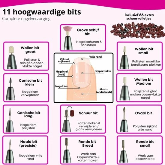 Dankzij de complete set met 25 multifunctionele bitjes, 4 accessoires (Glazen nagelvijl, Nagelstofkwastje, Bokkepoot en Nagelriem verwijderaar) 66 schuurolletjes voor het mandrel bitje is de set geschikt voor alle soorten (kunst)nagels en hardnekkig eelt. De nagelvijl wordt ook geleverd inclusief een stofkapje dat je over het bitje heen plaatst zodat de nagelstof op 1 plek blijft.