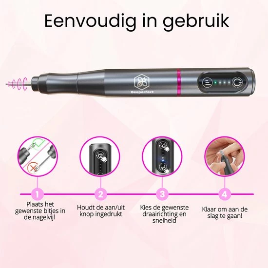 Geniet met de Beeperfect® nagelfrees van de nieuwste technologie: Draadloos, compact, licht, stevig, maar vooral erg comfortabel in gebruik! Door de schokabsorberende lager is de trilling zeer minimaal en is de nagelfrees stil in gebruik. De krachtige motor met een snelheid van 500 tot 20.000 RPM stel je gemakkelijk in via het controlepaneel op de nagelvijl, hiermee is geen enkele nagel te moeilijk. Links of rechtshandig? Geen probleem! Met de schakelaar kun je de draairichting bepalen.