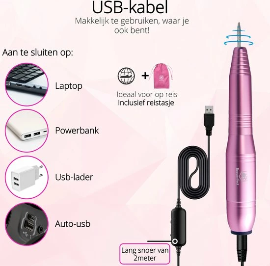 Dankzij het compacte model en het meegeleverde reistasje kun je de mani- en pedicure set overal gemakkelijk mee naar toe nemen! De lange kabel van 2 meter geeft jou de ideale bewegingsvrijheid en dankzij de USB-aansluiting kun je de nagelfrees overal gebruiken. Sluit het gemakkelijk aan op bijvoorbeeld een powerbank, USB-poort in de auto of een oplaadstation.