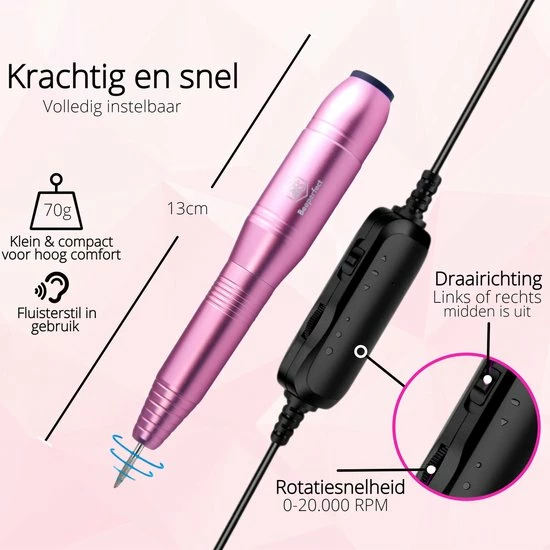 Geniet met de Beeperfect? nagelfrees van de nieuwste technologie: Klein, licht, stevig, maar vooral erg comfortabel in gebruik. Door de schokabsorberende lager is de trilling zeer minimaal en is de nagelfrees stil in gebruik. De krachtige motor met een snelheid van 500 tot 20.000 RPM stel je gemakkelijk traploos in via het controlepaneel op de kabel, hiermee is geen enkele nagel te moeilijk. Links of rechtshandig? Geen probleem! Met de schakelaar kun je de draairichting bepalen.