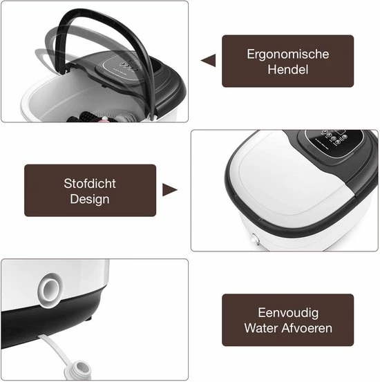 Ontworpen met een slanke en draagbare handgreep, kunt u het voetenbaf gemakkelijk vervoeren. Een afvoerslang en een stofdichte afdekking maken het gemakkelijker om het water af te voeren en het voetenbad schoon te houden.