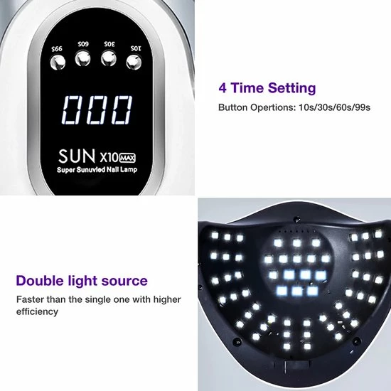 Hoe hoger het vermogen, hoe korter de droogtijd van de gel. De 280w/66 LEDs nageldroger verspreiden het licht evenredig over alle nagels tegelijk. De gel is in 10 tot 45 seconden uitgehard en droog, tot wel 3x sneller dan gemiddeld.