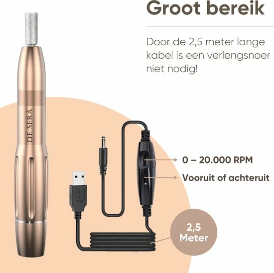 De elektrische nagelfrees werkt met een meegeleverde USB kabel van wel 2,5 meter lang. Hierdoor heb je een enorm bereik. Doordat de nagelfrees via USB werkt, is het bovendien mogelijk om de frees aan te sluiten op computer, laptop of powerbank. Hierdoor kun je je nagelfrees echt overal gebruiken.