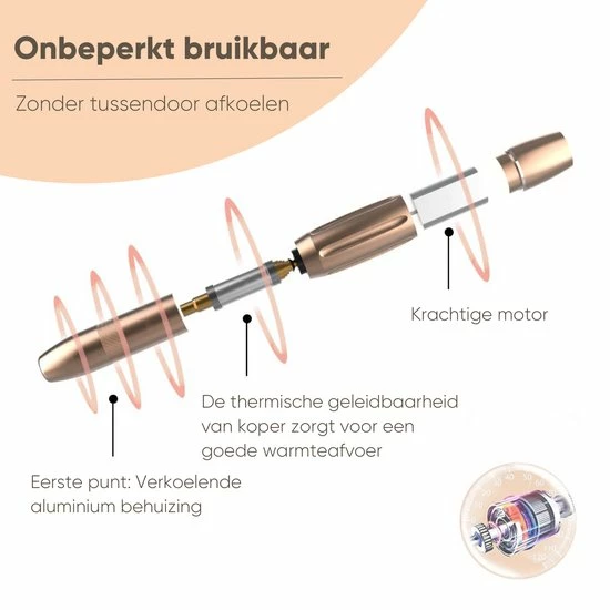 Een elektrische nagelfrees raakt nog wel eens oververhit, wanneer je deze lang gebruikt. Deze elektrische nagelfrees van De Sera niet! Door de materiaalkeuze van het apparaat ?n het omhulsel wordt deze minder heet, waardoor je de nagelfrees onbeperkt kan gebruiken, zonder dat deze tussendoor af moet koelen. Zo kun je continu doorgaan met de verzorging van jouw prachtige nagels.