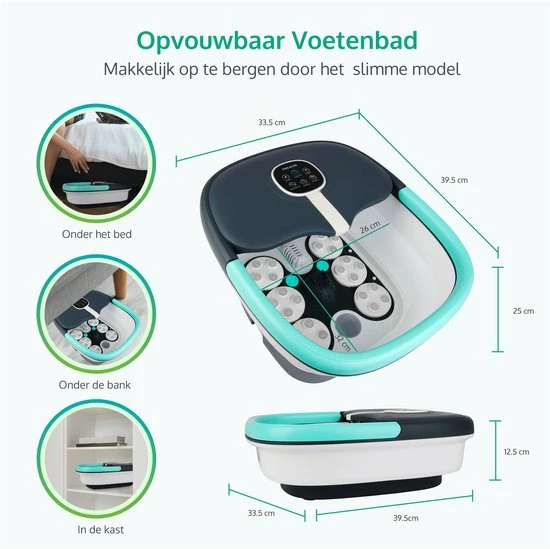 Opvouwbaar voetenbad – Een groot voordeel is dat het voetenbad opvouwbaar is. Het voetenbad van Dreaver is eenvoudig opvouwbaar en past onder iedere bank ! Zo kun je na een heerlijk voetenbad deze binnen enkele seconden opvouwen en opbergen zonder dat het veel ruimte in beslag neemt.