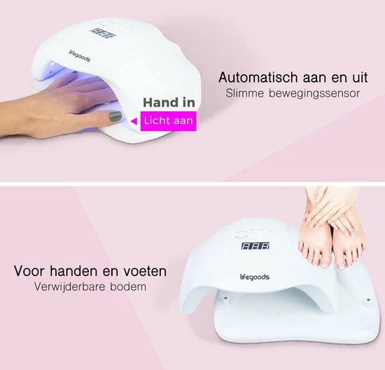 De LifeGoods nageldroger heeft 36 sterke 54 Watt LED UV-lampen. In 30-60 seconden zijn de nagels van je hand of voet droog en uitgehard, 3x sneller dan gemiddeld. Basecoats, topcoats, gelpolish of builder gels, je hebt altijd perfecte polymerisatie dankzij de dubbele golflengte technologie. Bewegingssensoren zetten de nageldroger automatisch aan en uit, dus je verpest nooit meer natte nagels aan knopjes! Kies uit handige opties zoals een low-heat functie, 4 timers (15s,30s,60s,99s) of sla je persoonlijke instellingen op met de memory functie. De perfecte nageldroger voor thuis of in de salon!