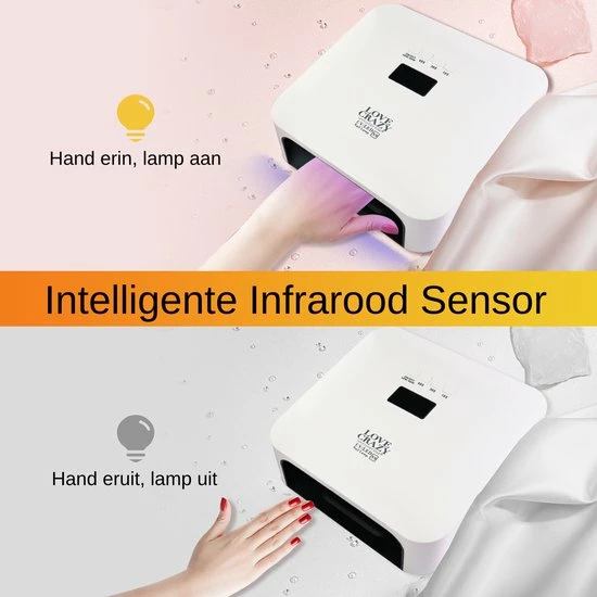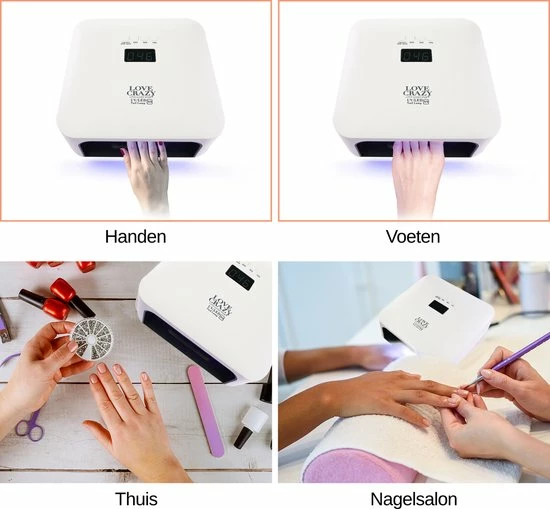 De LoveCrazy nageldroger heeft 33 sterke 60 Watt LED UV-lampen. In 30-60 seconden zijn de nagels van je hand of voet droog en uitgehard. Basecoats, topcoats, gelpolish of builder gels, je hebt altijd perfecte polymerisatie dankzij de dubbele golflengte technologie. Bewegingssensoren zetten de nageldroger automatisch aan en uit, dus je verpest nooit meer natte nagels aan knopjes! Kies uit handige opties zoals een low-heat functie, 3 timers (10s,30s,60s). De perfecte nageldroger voor thuis of in de salon!