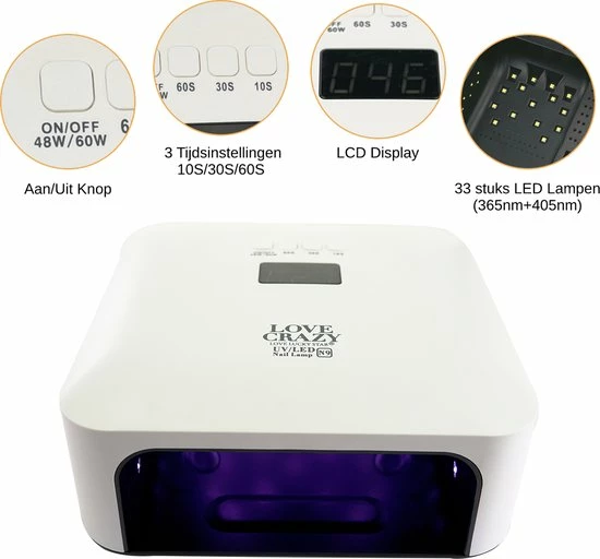 Hoe hoger het wattage, hoe korter de droogtijd van de gel. De 33 krachtige 60W LED UV-lampen in de LoveCrazy nageldroger verspreiden het licht evenredig over alle nagels tegelijk. De gel is in 30 tot 60 seconden uitgehard en droog.