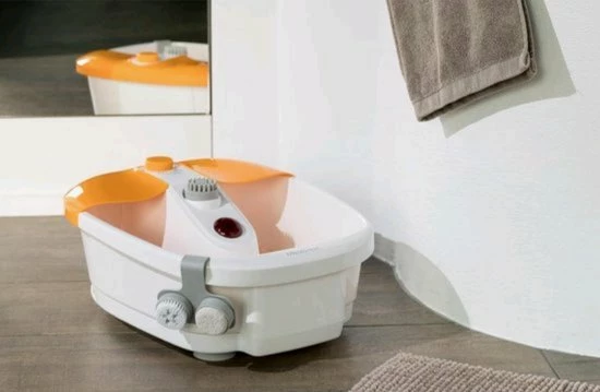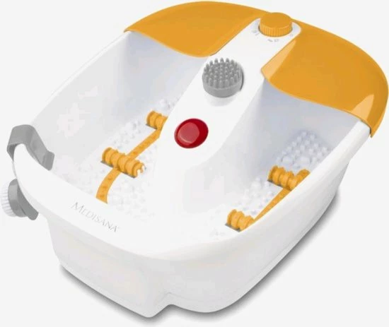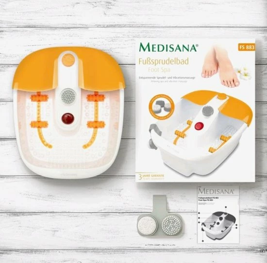 Dit Medisana voetbad FS 883 combineert 3 functies in 1 apparaat: het biedt een bubbelmassage, een trillingsmassage en heeft bovendien een automatische verwarmfunctie. Indien u slechts uw voeten op wilt warmen omdat ze koud zijn, kunt u ook simpelweg het water verwarmen zonder de massagefunctie te gebruiken. De massagerollers in het midden van het voetbad helpen het binnenste gedeelte van de voet te masseren. Levering bevat 3 verwisselbare pedicure hulpstukken (eeltverwijderaar, borstel, massagehulpstuk) Kleur: wit en geel Materiaal: kunststof Afmetingen: 35,3 cm x 41,8 cm x 19,3 cm (B x D x H) Voltage: 230 V~/50 Hz Maximale vermogen: 80 W 3 functies in 1: waterverwarming, bubbel- en trillingsmassage en intensieve reflexologie Met 3 verwisselbare pedicure hulpstukken (eeltverwijderaar, borstel, massagehulpstuk) Ontspannende spa- en trillingsmassage Massage-ondersteunend voetbed Warmwaterfunctie Verwijderbare spatbescherming Massagerollers in het midden van het voetbad om de binnenkant van de voet te masseren Rubberen anti-slip pootjes Aangename infraroodfunctie