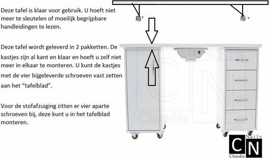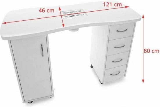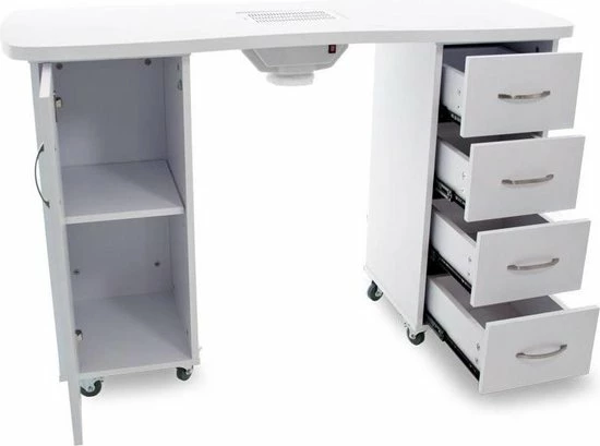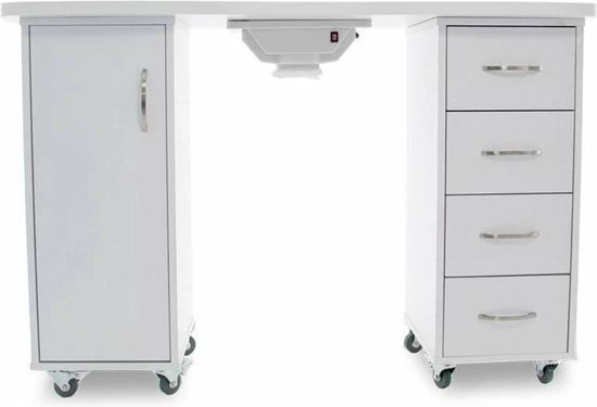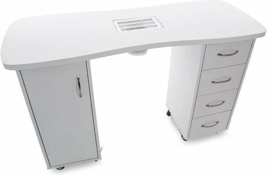 Deze manicuretafel heeft een stil afzuigsysteem met gebruik van een stofzakje, deze tafel beschikt over 2 lades en 4 kastjes.