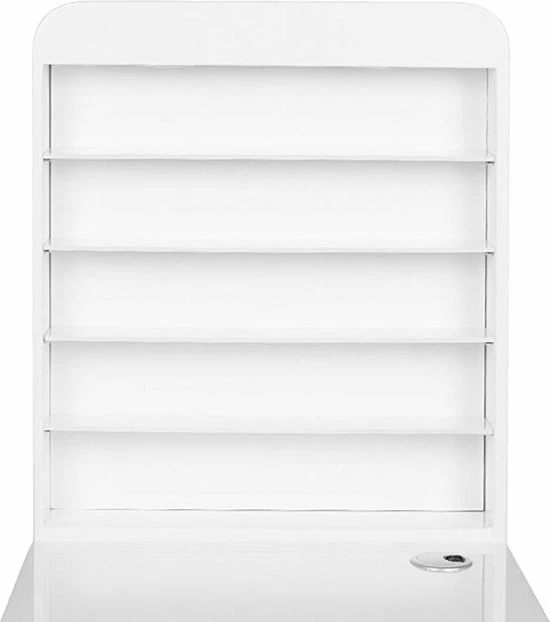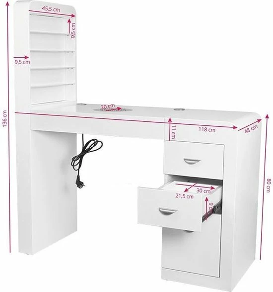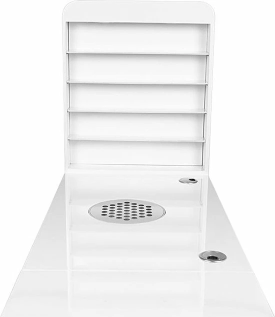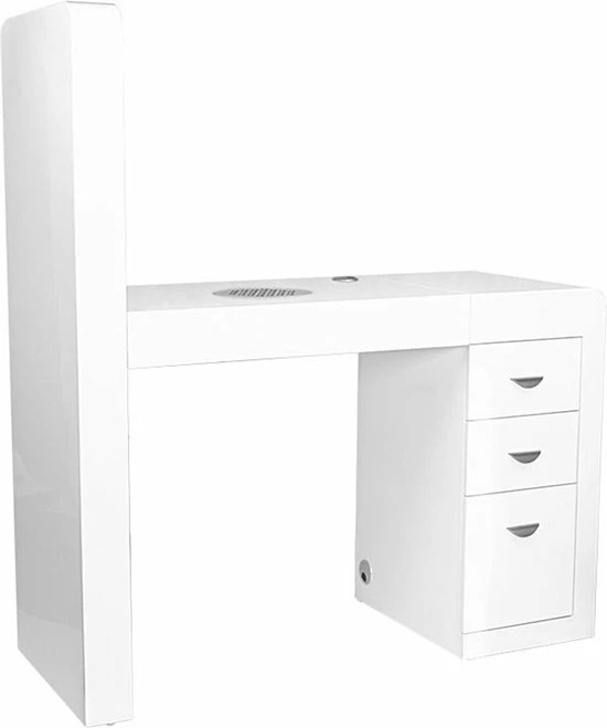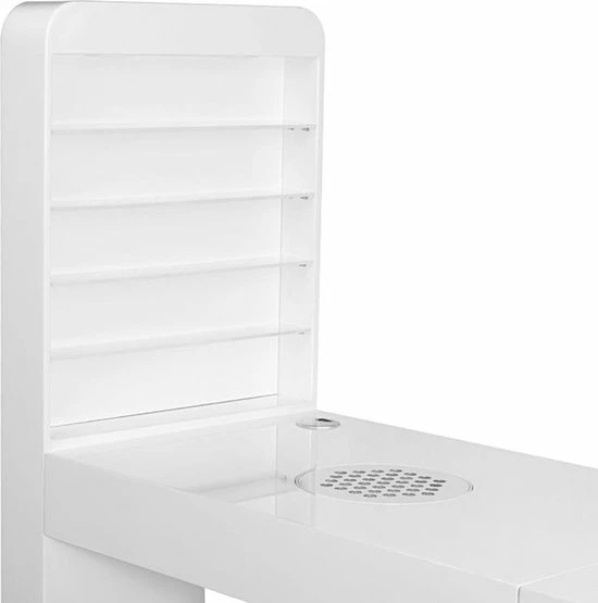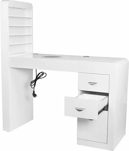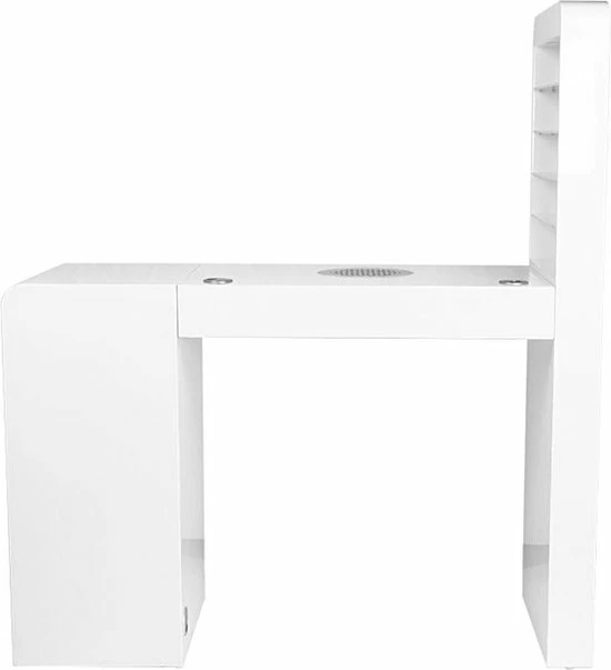 Een zeer functionele manicure tafel voor uw salon welke drie functies combineert: ruime werktafel, afzuiging welke is ingebouwd in de tafel en voldoende opberg ruimte voor uw producten + een handige wand voor het displayen van uw bijvoorbeeld uw gellak, glitters of acryl. De tafel heeft een tijdloze uitstraling en zal goed passen bij diverse stijlen en is voorzien van een handig kastje voor het netjes opbergen van uw spullen. Daarnaast is de tafel voorzien van 2 speciale uitsparingen voor kabels van bijvoorbeeld uw lamp of freesmachine, zodat deze niet in de weg liggen op uw werkplek.