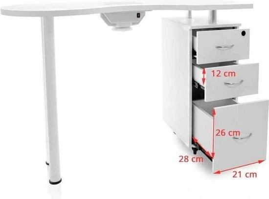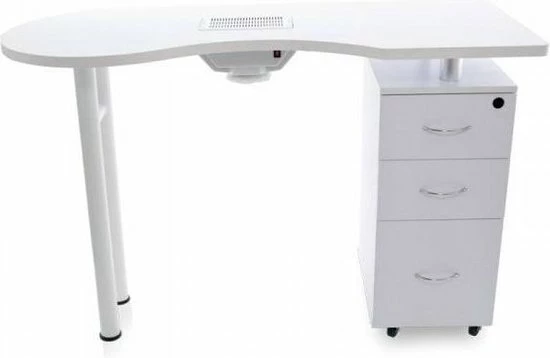 Deze stabiele manicuretafel is voorzien van een ingebouwde stofafzuiging en een ladekast. De ladekast bestaat uit drie laden waarvan 1 met slot.
