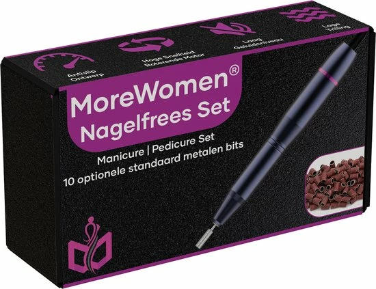 Met de MoreWomen® Nagelfrees haal je de nagelstudio in huis. De elektrische nagelvijl is compact in formaat, maar uitgebreid in functionaliteit. Je kunt er thuis namelijk professioneel mee aan de slag, door de 11 bitjes. Dit maakt het dat het ideaal is voor niet alleen het vijlen, maar voor alles, zoals ook het polijsten en het exfoliëren van je nagels. De nagelfrees kan zowel vooruit als achteruit draaien, zodat het voor rechtshandige en linkshandige is te gebruiken.