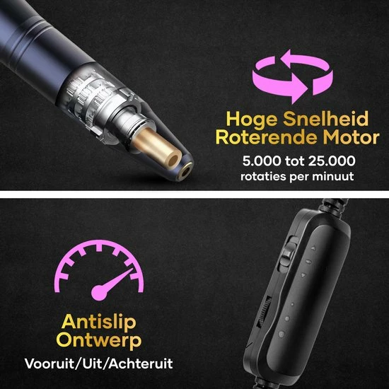 De Elektrische Nagelvijl van MoreWomen® zorgt voor minimale vibratie zodat je zo secuur mogelijk je nagels kunt verzorgen. Daarbij is de nagelfrees erg fijn in het gebruik. De elektrische nagelvijl is voorzien van antislip en voor links- en rechtshandige. De antislip zorgt ervoor dat je de nagelvijl zo fijn mogelijk vast hebt. Het vooruit en achteruit kunnen draaien van de vijl zorgt ervoor dat het voor links- en rechtshandige makkelijk is te gebruiken. De snoerlengte is 1 meter om ruimte te geven bij het verzorgen van de nagels en het design van de nagelfrees zorgt ervoor dat het geluidsniveau laag is.