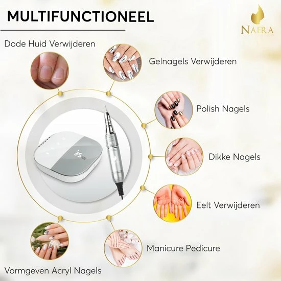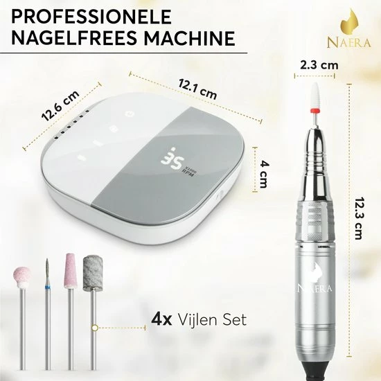 Doe vandaag eens echt iets voor jezelf en bestel de elektrische nagelfrees van Naera! Een professionele manicure set met 4 vijlen, simpel te bedienen base unit en ergonomisch ontworpen freespen. Ideaal voor thuisgebruik, past perfect in de beautysalon en zeer geschikt voor mensen met spier- en gewrichtsklachten! De aluminium nagelfrees machine maakt gebruik van maximaal 35.000 RPM en is extra zacht in zijn geluid en trilling. Het leven is niet perfect, maar je nagels kunnen dit wel zijn!