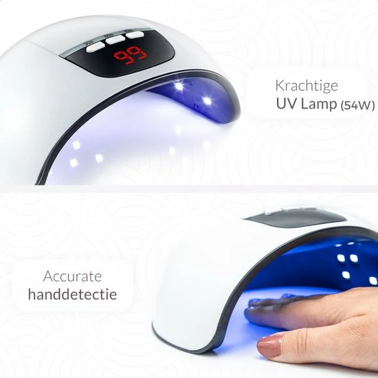 De bijgeleverde 54W LED lamp is zeer krachtig en beschikt over bewegingssensoren die de lamp automatische aan en uit zetten waardoor je nooit meer een nagel verpest door op een knopje te hoeven drukken. Je kuist eenvoudig uit 3 verschillende timers met 30s, 60s en 99s.