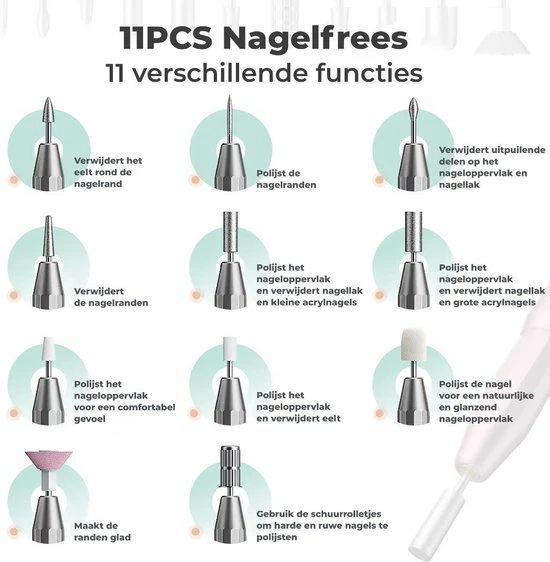 Een goede manicure doet wonderen voor je nagels. De manicure- en pedicureset heeft maar liefst 11 nagelfrees opzetstukjes, voor alles van vijlen, schuren, polijsten tot exfoli?ren. Daarnaast komt deze set inclusief 56 schuurrolletjes, zodat je voldoende voorraad hebt om je nagels lang te verzorgen!