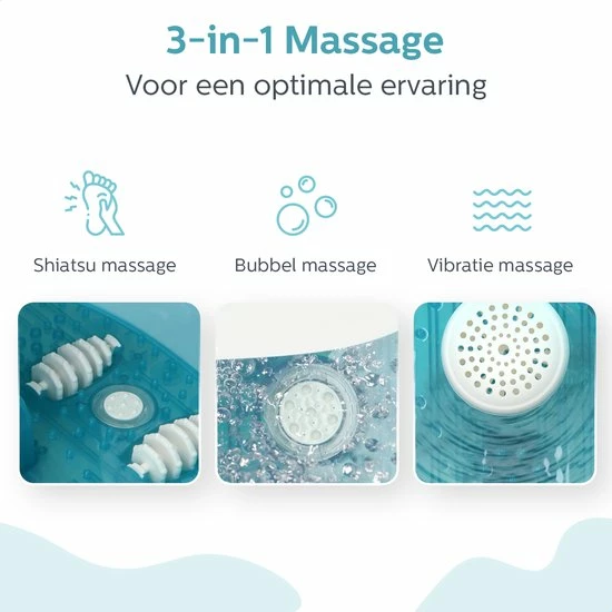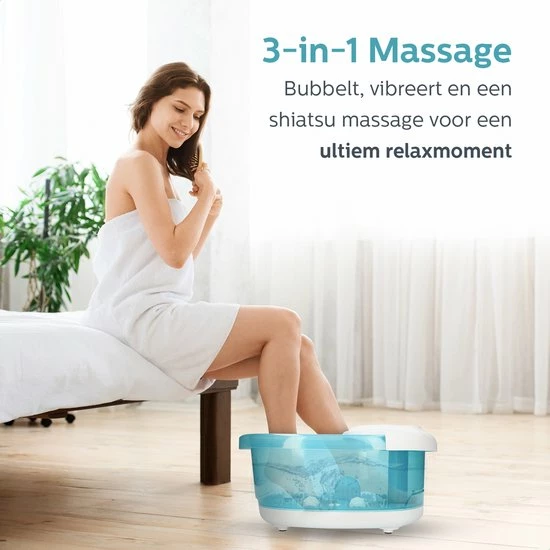 Dankzij de bubbelfunctie kan er een kalmerend bubbelbad voor de voeten worden gecre?erd, zodat je kan ontspannen na een lange dag. De vibrerende functie zorgt dat vermoeidheid van de voeten verdwijnt en de triggerpoints laten de voeten optimaal ontspannen. Alle functies kunnen gemakkelijk worden ingesteld via het duidelijke en praktische lcd-scherm.