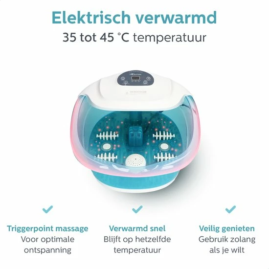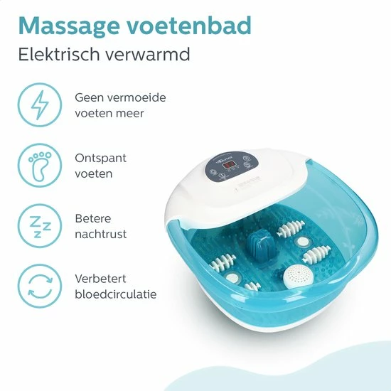 Verzorg je voeten en kom heerlijk tot rust met het verwarmde voetenbad van Qumax. Het luxe voetenbad bubbelt, vibreert en is voorzien van massagerollers voor een ultiem relaxmoment. Via het lcd-scherm kun je alle functies eenvoudig en snel instellen, waarna je kan genieten van een rustgevend en stressverminderend voetenbad.