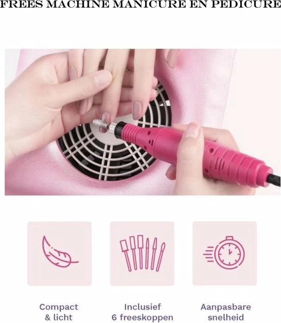Met de Manicure- en pedicureset haal je een professionele nagelstudio in huis! Zeer compact in formaat, maar uitgebreid in functionaliteit. Inclusief 6 nagelfrees opzetstukjes en 6 schuurpads welke je nagels mooi en gezond houden. Polijsten, vijlen, exfoli?ren, alles kan! De nagelfrees draait zowel voor- als achteruit en is dus zowel de linker- als de rechterhand te gebruiken. Met een laag geluidsvolume, weinig vibraties en een aanpasbare snelheidvoor zowel de ervaren als beginnende nagelartiest